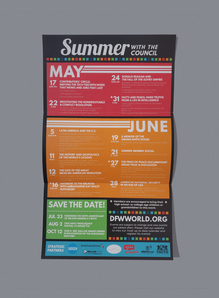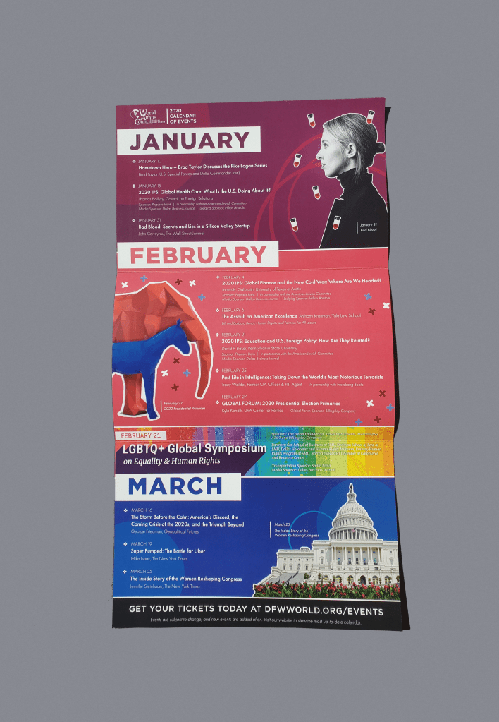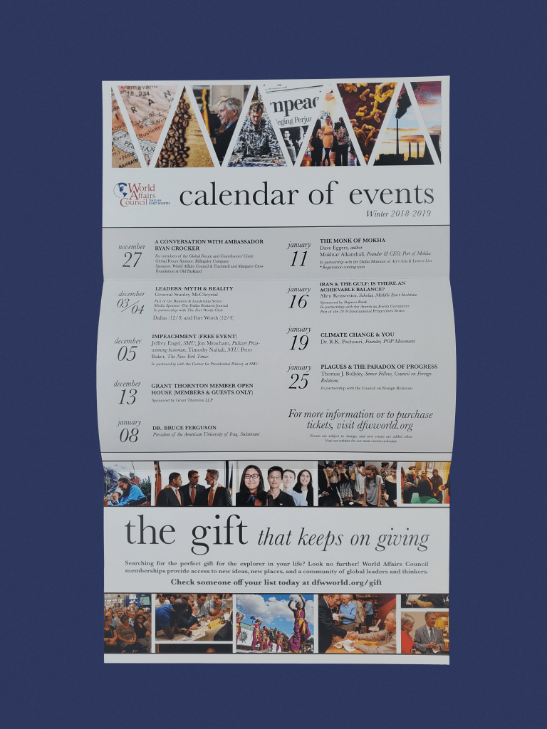 The client presented more than 270 speaker events during my time working with them. Programs ranged from heads of states and ambassadors to best-selling authors and activists. Every quarter, the council would mail a calendar to their members about upcoming events to spread awareness.
