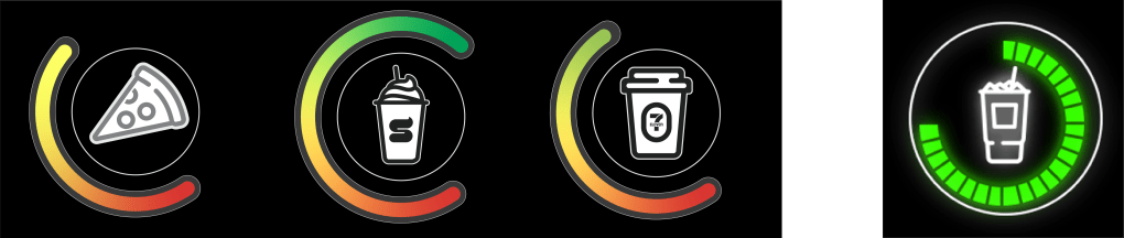 To solve this, we experimented with scaling up the brand names and letting the cups break the boundaries of their circles for added emphasis. The final round of revisions brought everything together—just 24 hours before the commercial shoot. In that last pass, I added a subtle tick-mark ring to anchor the gauge and removed the numbers for a more simplified, focused look. The result was a design that felt confident, balanced, and true to the brand.
